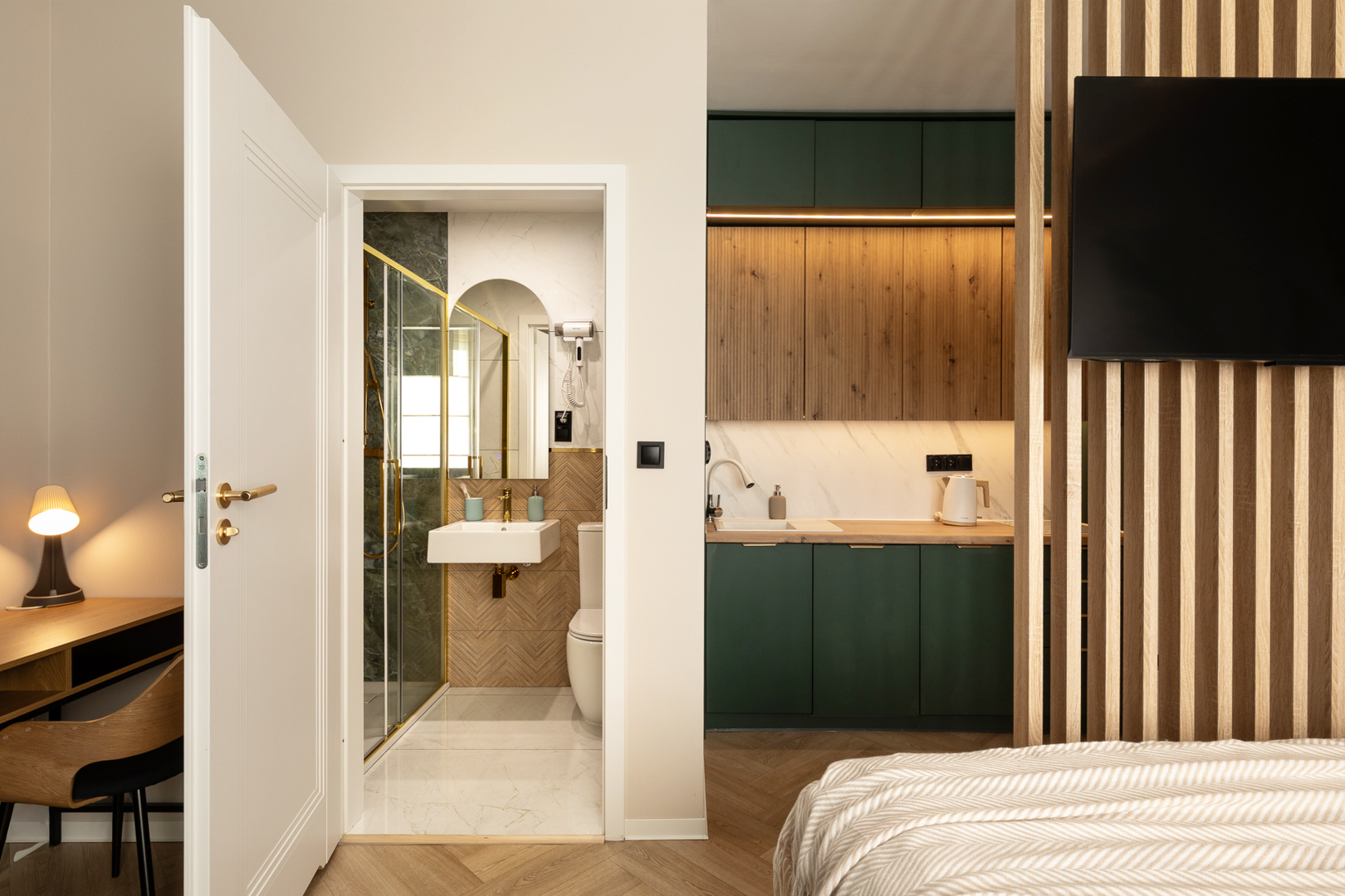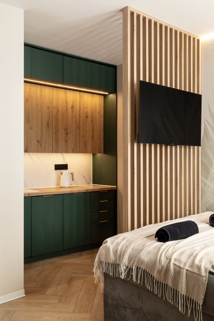 Glam-Studio to nowocześnie urządzony 20-metrowy apartament z prywatną łazienką z prysznicem, aneksem kuchennym i częścią sypialną. W łazience znajduje się suszarka do włosów, jednorazowa szczoteczka z pastą i żel pod prysznic.